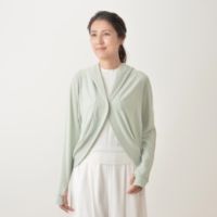 リブ飾り編みのカットソー素材を使用。さらっとした肌触りのボレロです。伸縮性があって軽く、着心地もラクチン。