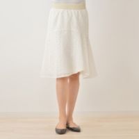 アシンメトリーに入ったドレープがクチュール的なデザインスカート。繊細な花の刺繍を施した総レース仕立てで、ふんわりとしたシルエットが女性らしく、華やかな印象をもたらします。