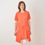 デザインスカートを前で結んだり、後ろで結んだり、アレンジした着まわしが楽しめるラップスカート風チュニックです。