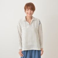 肌触りがよく伸縮性があり、シワになりにくい素材で仕立てたシャツブラウスです。肩幅は広めに、身幅もたっぷり取ったリラックスシルエットながら、脇のラインを前に振ることで、細見え効果が期待できるデザイン。
