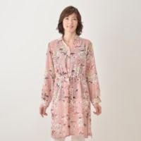 シフォン素材で仕立てた、前開きのチュニックシャツです。身体のラインを拾いにくい、裾が広がったAラインのシルエット。