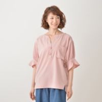 ウエストサイドにタックを寄せた、Aラインのシルエットのハーフジップシャツ。タックによるドレープがお腹まわりをカバーしながら、女性らしさのあるデザインです。