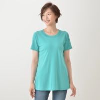 カットソーながら、布帛のようにしっかりとした風合いの生地で仕立てたチュニック。袖はフレンチに、裾の脇は丸くカーブさせて、大人可愛らしさが漂う雰囲気です。