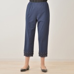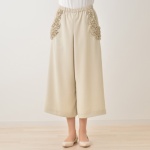 フリルとビーズがアクセントになった、可憐なパンツです。定番シルエットの、ハイテンションストレッチパンツ。