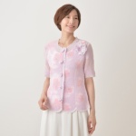 爽やかで上品な装いを演出する、半袖のパッチワークジャケットです。清涼感のある薄手の素材に、グラデーション配色のお花を一つ一つパッチワークして咲かせました。