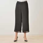 柔らかなシフォンをベースに、ラメ入りのドット柄を織り込んだ素材で仕立てたパンツです。クリスタルプリーツという、真っ直ぐに畝を作っていくプリーツを使用。
