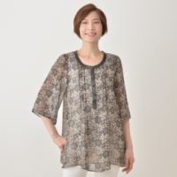 サラリとした肌触りの薄手のシアー感ある生地に、フラワー柄をプリントしたブラウスです。体のラインを程良くカバーする、ゆるやかなAラインのシルエット。