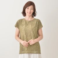 やわらかな肌ざわりのカットソーブラウスです。表側の素材には美しい光沢感のレース、裏側の素材には、レーヨンとオーガニックコットン天竺を配した2枚仕立て。