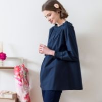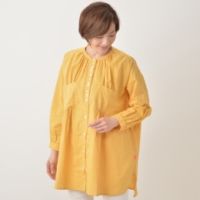 ブロード素材で仕立てた、チュニック丈のブラウスです。衿元と袖口に配色のシャーリングを施し、クラシカルな表情に仕上げました。
