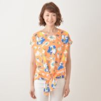 大き目のフラワープリントを総柄にした生地を使用した、華やかなブラウスをご紹介。リラックス感のあるゆったりシルエットながら、前身頃の裾部分を結ぶデザインで、おなか周りをきれいに見せてくれます。