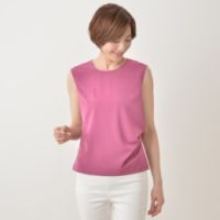 伸縮性があって着心地がよい、縦横の2Wayストレッチ素材を使用したノースリーブブラウスです。高級感のある素材ながらカジュアルにも着こなせる、シルクのような風合いのポリエステルを使用。