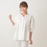 ガーゼ生地でふんわりした優しい肌触りのブラウスです。シンプルで飽きのこないデザイン。襟元は開きすぎず、一枚で着ても中にセーターなどを着てもきれいに見えます。