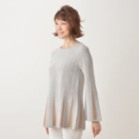 ストレートヤーンを使用した、フレアたっぷりのニットチュニック。2本取りの糸使いで天竺編みにし、薄過ぎずフレアの出る編み地で仕上げました。
