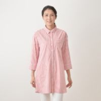 着丈の長い、ストライプのブラウスをご紹介します。肌触りのよいサラサラした素材を使用。肌離れもよく、取り扱いもラクチンです。