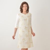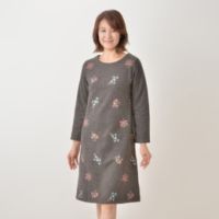 伸縮性があるリブ素材で、着心地のよいワンピースです。前身頃には花のモチーフを散りばめたフェミニンなデザインで、優しい印象に。