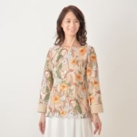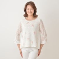 刺繍を配したレース生地が、上品な印象を醸すプルオーバーです。身頃両サイドと袖口はシフォン生地で切り替え、より女性らしい雰囲気に仕立てました。