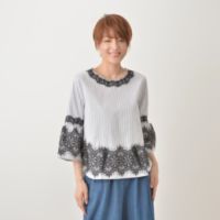 着心地の良い綿素材で仕立てたプルオーバー。衿、袖口、身頃の裾部分にレースをあしらうことで、クールな色合いのストライプ柄に華やかさを添えています。