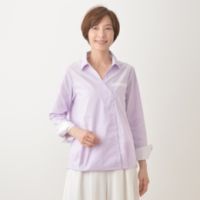 肌触りがよく伸縮性があり、シワになりにくい素材で仕立てたシャツブラウスです。肩幅は広めに、身幅もたっぷり取ったリラックスシルエットながら、脇のラインを前に振ることで、細見え効果が期待できるデザイン。