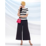 大人っぽいボーダー柄のジャージ素材で仕立てたワンピース。左ウエストに向かって入れたドレープが、身体のシルエットをカモフラージュしてくれます。
