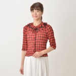 シフォン素材で仕立てた、ギンガムチェックのジャケットです。複数の素材で作った襟ぐりのお花モチーフが、立体感のある表情でお顔周りを華やかに演出。肘が隠れる袖丈で、長いシーズンで活躍します。