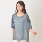 プルオーバータイプのブラウスです。リズミカルな配列で刺繍のようなプリントを施した、さらりとした布帛素材を使用。