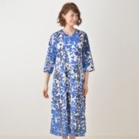 リーフ柄のプリント生地を使った、前あきのワンピースです。リーフ部分のカラーは、グラデーション配色に。