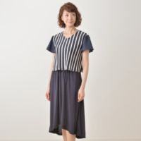 裾に2重線のラインが入った、マリンテイストを感じさせるワンピースです。なめらかで程よい伸びのある、ポリエステルと綿混紡のスムース素材を使用。