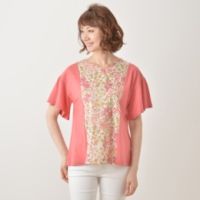 袖部分の透け感と袖口のフレアーがフェミニンなプルオーバー。袖部分はジョーゼット素材に花柄プリントを施し、袖口は無地のフレアーデザインに。