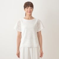 ドルマンスリーブのニットプルオーバーです。メッシュの編地を、肩から脇にかけて入れたデザイン。透け感のあるメッシュの編地が、肩から脇にシャドウ効果を与え、身幅を狭く見せることで着痩せ効果が期待できます。…