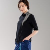 さらりとクールな肌触りの、ポリエステル強撚スムースを使用。立体的なタックドレープがニュアンスをつくるトップスです。