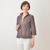 シンプルで着こなしやすい、ノーカラーデザインのジャケットです。さらっとしたドライな肌ざわりで、ハリのある素材を使用。