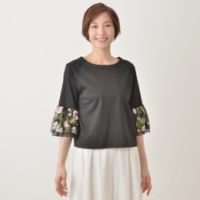 袖部分の透け感と袖口のフレアーがフェミニンなプルオーバー。袖部分はジョーゼット素材に花柄プリントを施し、袖口は無地のフレアーデザインに。やさしい雰囲気ながら、華やかさを醸す一枚です。