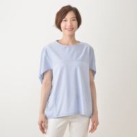 ストレッチポプリンを使い、繊細なチュールをアクセントに施した、涼しげで大人可愛いプルオーバーです。肩を優しく包むドロップショルダーには、ギャザーを寄せてデザイン。