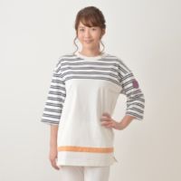 変形袖のデザインが印象的なプルオーバーです。ボーダー柄の出方を縦と横の切り替えで表現しました。ボーダーのピッチを細くすることで、カジュアル過ぎない大人の印象に。