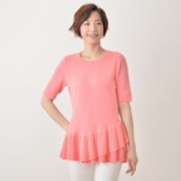 生地がすれにくく、通気性にすぐれてやわらか。コットンとレーヨンのブレンド素材のチュニックです。可愛らしくフリルが寄ったチューリップヘムで、スタイルアップ。