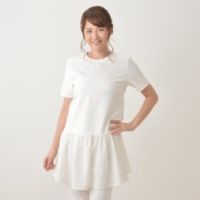 前後にタックを入れて、ふわっとしたシルエットに仕上げたチュニックです。イージーケアーでシワになりにくく、ひんやりとした肌ざわりのスラブ調カットソーを使用。