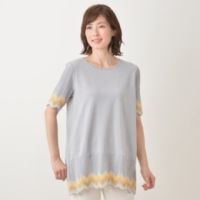 袖口と裾に、矢振り柄でカラーボーダーをデザインしたニットチュニックです。本体には、清涼感と光沢感が特徴的な、シルケット加工を施したコットン糸を使用。