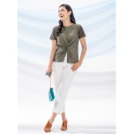 伸びの良い、しっかりしたカットソー生地を使用したTシャツです。ラウンドネックでカジュアル感を出し、左胸には小さい配色のポケットを付けて、別布上からジグザグステッチをかけた加工に。袖と後身頃はすっきりと仕上げ、裾には前後差をつけて、両脇はスリット入りに。パンツでもスカートでも合わせやすい丈感で、トップスインしたアレンジもしやすくなっています。