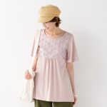 アイレット刺繍を施したフレアスリーブが、程よい透け感で涼しげな印象。身生地にはカットソー素材を使って着心地良く仕立てたチュニックのご紹介です。