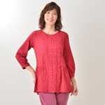フロントに3種類の幅違いのレースを配した、華やかなチュニックです。身生地は、中肉で軽くシワになりにくい、目面のきれいなポンチ素材を使用。