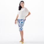 花柄のレースにフラワープリントを施した生地で、贅沢な総レーススカートをおつくりしました。華やかな柄を活かすため、形はシンプルなタイトスカートにデザイン。