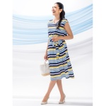 大人っぽいボーダー柄のジャージ素材で仕立てたワンピース。左ウエストに向かって入れたドレープが、身体のシルエットをカモフラージュしてくれます。