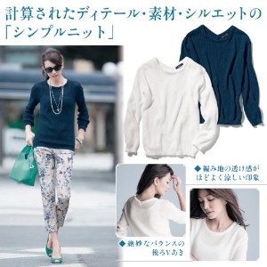 『セーター』を楽天市場で検索する 『セーター』をヤフー!ショッピングで検索する 『セーター』をアマゾンで検索する 『セーター』をベルメゾンネットで検索する 『セーター』をヤフオク!で検索する 気軽に着られるメッシュ調の鹿の子編みサマーニット。サラッとした綿糸に細く光沢のあるポリエステル糸を加えているので、軽い着心地で暑苦しくありません。編み目からうっすらと透けるインナーとのコーディネートも楽しみのひとつ。前はシンプルなクルーネックだけど、後ろはあえてVあきにして、首のラインをすっきり見せるとともに着こなしの鮮度を上げています。パンツにもスカートにも合わせやすいシルエットは、ぴったりすぎず、ゆったりすぎないほどよいゆとりが、体型カバーをしながらさりげない大人のオシャレを演出します。日本…