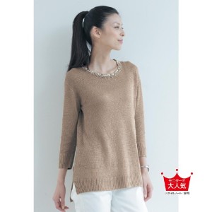 『セーター』を楽天市場で検索する 『セーター』をヤフー!ショッピングで検索する 『セーター』をアマゾンで検索する 『セーター』をベルメゾンネットで検索する 『セーター』をヤフオク!で検索する 上質な麻100%の糸でざっくり編んだ、見た目も着心地も涼しいプルオーバー。衿ぐりを囲むビジューはリッチな煌めきを放つものを、贅沢に使いました。シンプルな中に映え、表情をひと際華やかに彩ります。裾にかけてゆるやかに広がった女性らしいシルエットに、前後差のある軽快な着丈でヒップラインもしっかりカバーできます。後ろ衿ぐりはナミダあきに。