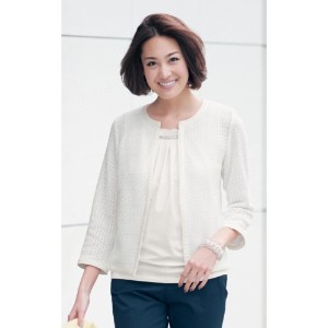 『ノーカラー・スタンドカラージャケット』を楽天市場で検索する 『ノーカラー・スタンドカラージャケット』をヤフー!ショッピングで検索する 『ノーカラー・スタンドカラージャケット』をアマゾンで検索する 『ノーカラー・スタンドカラージャケット』をベルメゾンネットで検索する 『ノーカラー・スタンドカラージャケット』をヤフオク!で検索する 涼しげなホワイトの糸で織ったラッセルレース素材を使用したジャケットは、ほどよい厚みと伸びのよさで着こなしやすい一枚。通気性も良く夏の羽織物にぴったりです。シンプルなノーカラーで顔まわりの印象もすっきり。カーディガン感覚で羽織れる軽やかさも魅力。衿ぐりや前立て、袖口を布はくでトリミングした、きちんとした仕立て。
