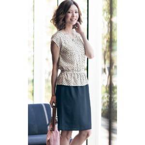 1枚で決まる簡単おしゃれな時短アイテム。流行のぺプラムブラウスとタイトスカートがひとつに。ブラウス部分はドット柄の光沢のある素材。スカート部分は織り表情のある素材で、裏地付き。