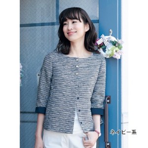 襟ぐりのパイピングやタックが女性らしく上品なノーカラージャケット。ウエストのぺプラム切替えで腰高に見せることができます。