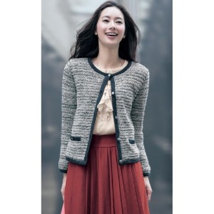 涼しげな表情を持つ、ほのかにラメ糸が入ったファンシーツイード素材のノーカラージャケット。ピュアなデザインに、ブレードやフリンジ使いで華を添えました。
