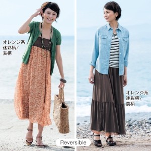 ミッキーが潜んだ総柄と、シンプルな無地の両方が楽しめるリバーシブル仕様。マキシ丈スカートとしても、ワンピースとしても着られて印象は自在。