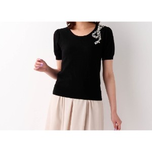 パフスリーブでラブリーさを強調したデザイン。パール調ビーズやスパンコール、ラインストーンをあしらった左肩のビジューリボンが素敵なワンポイント。薄手の綿レーヨン混ニットだから、夏の終わりから活躍します。